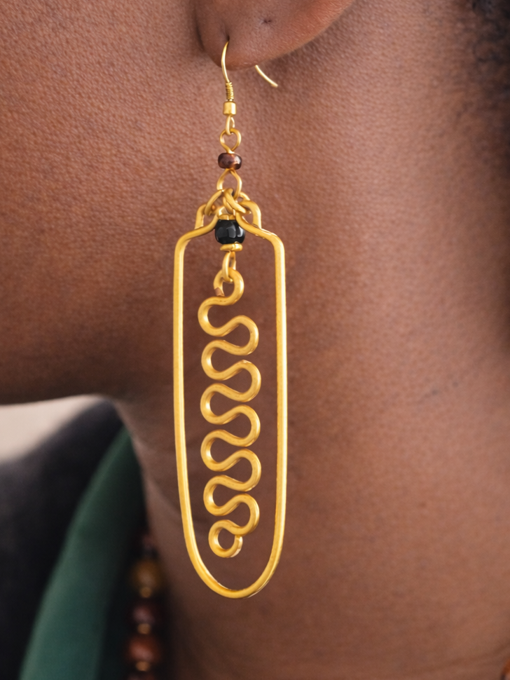 Ces boucles d’oreilles élancées dévoilent une silhouette serpentiforme délicatement dessinée au centre d’un cadre ovale doré. Le serpent, symbole ancestral de transformation, de protection et de renaissance, apporte à ce bijou une dimension forte et intemporelle.