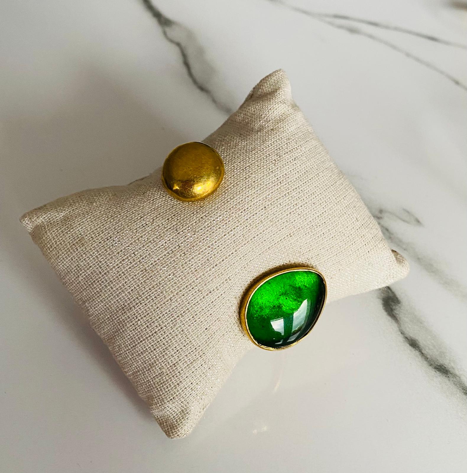 L’élégance minimaliste rencontre la force des pierres avec ce bracelet ouvert doré. Orné d’une pierre de verre verte intense et d’un embout martelé doré, il incarne l’équilibre entre modernité et authenticité. Léger et ajustable, il se porte aussi bien seul qu’en accumulation, ajoutant une touche raffinée à toutes vos tenues.