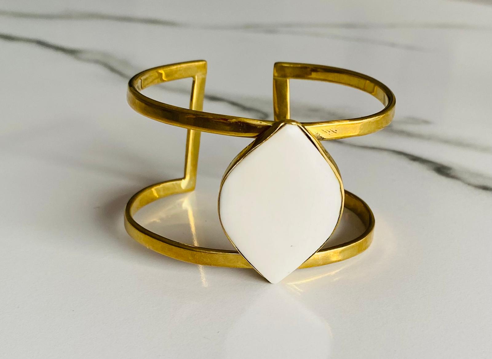 La ligne épurée du bracelet souligne le poignet avec finesse, tandis que la goutte blanche en os attire naturellement le regard.