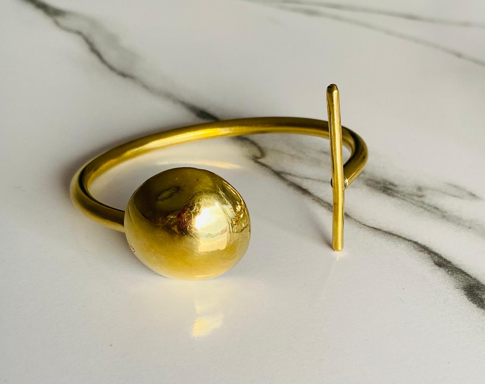 Ce bracelet doré se distingue par son design sculptural et contemporain, combinant une sphère pleine d’un côté et une barre verticale minimaliste de l’autre.