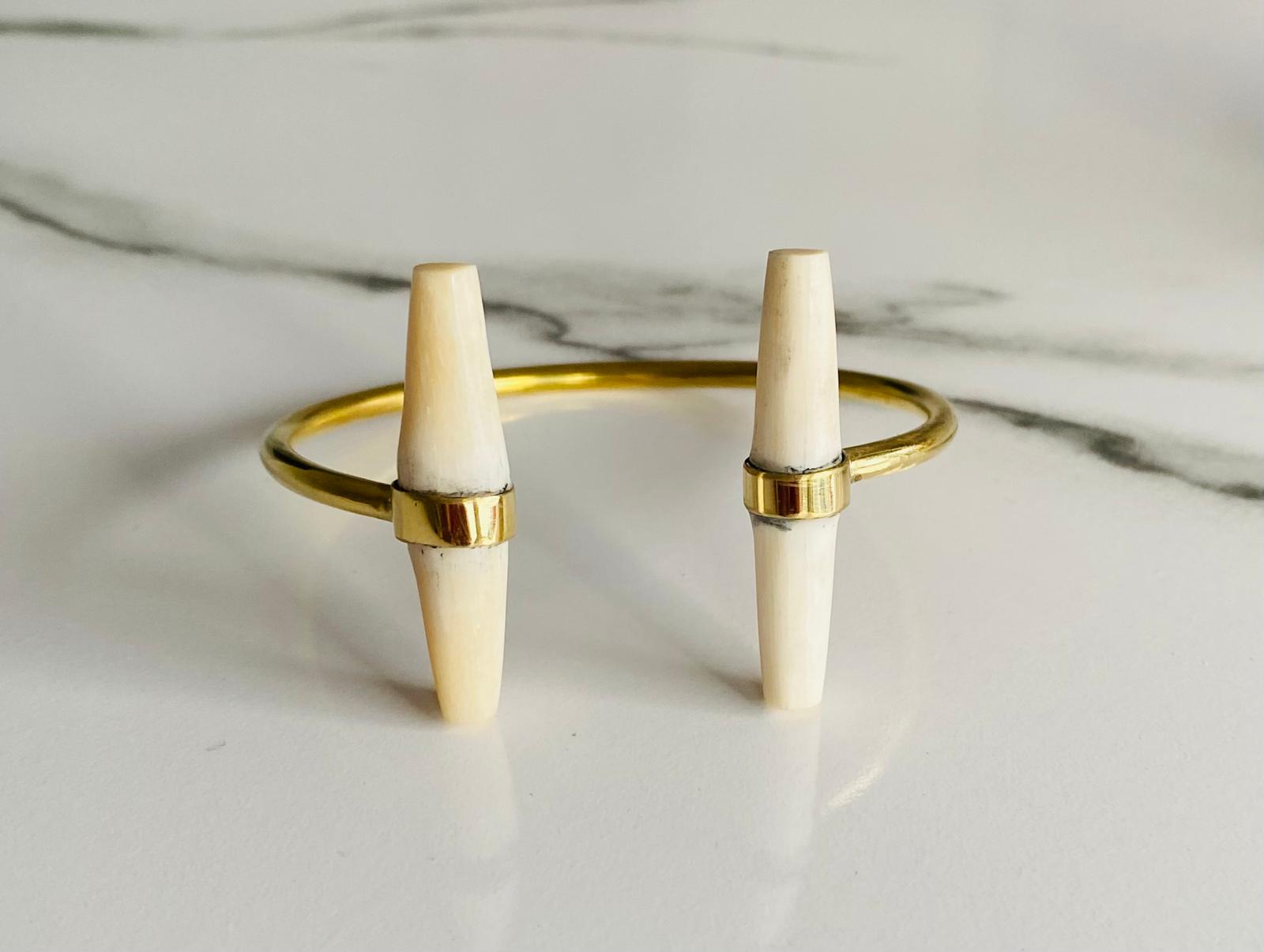 Ce bracelet ouvert allie élégance et authenticité grâce à ses deux pointes sculptées en os naturel, délicatement cerclées d’un anneau doré. Chaque pièce est façonnée à la main, ce qui en fait un bijou unique, aux nuances et irrégularités qui témoignent du travail artisanal.