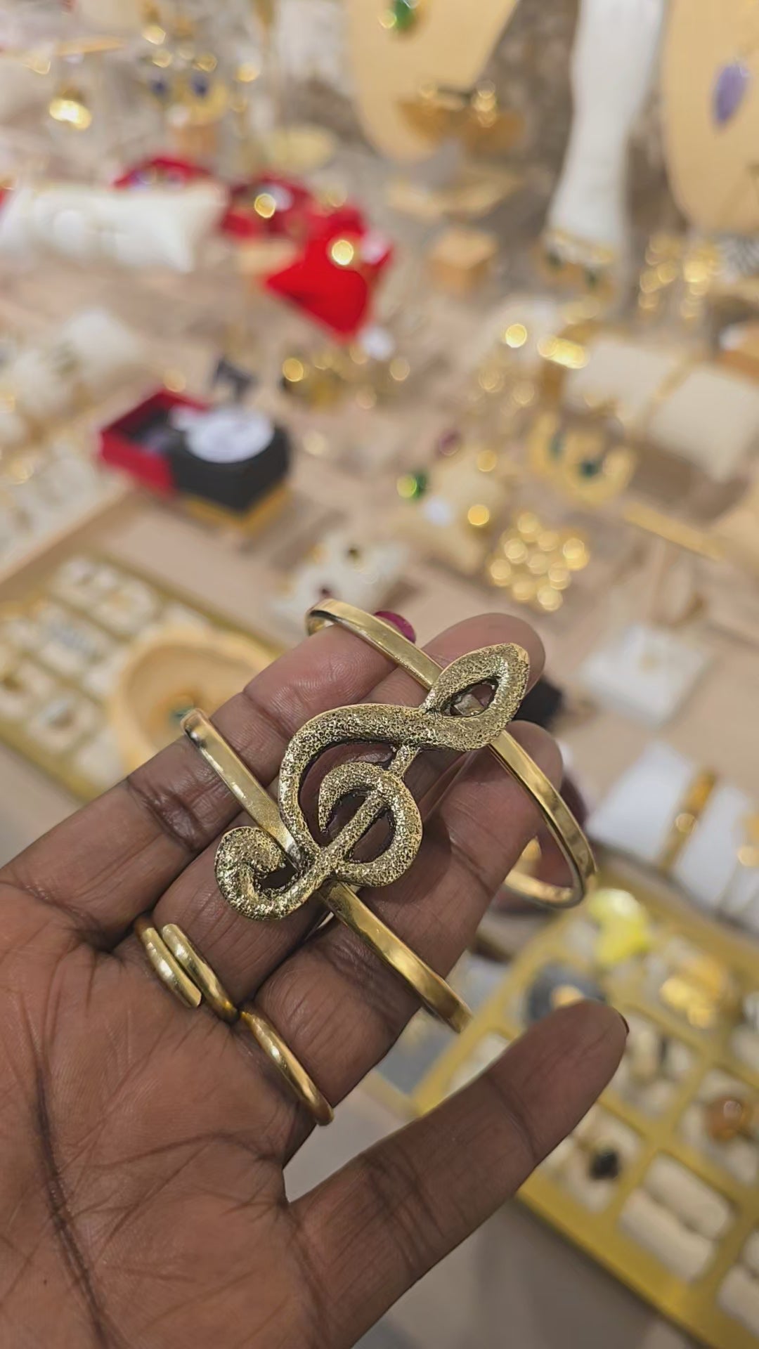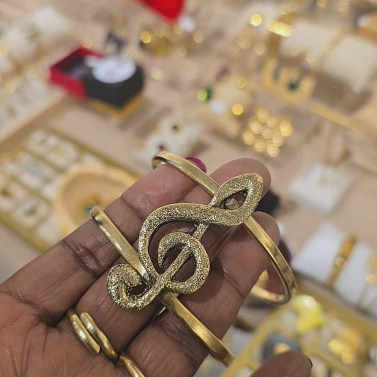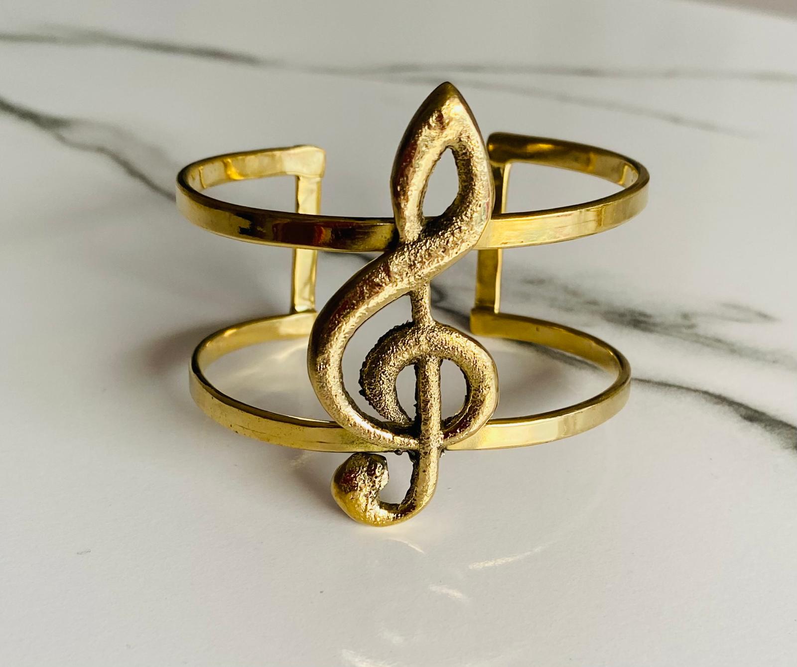 Ce bracelet doré célèbre l’union parfaite entre l’art et la musique. Au centre, une clé de sol sculptée se détache sur une structure double anneaux, créant une pièce expressive, symbolique et lumineuse.